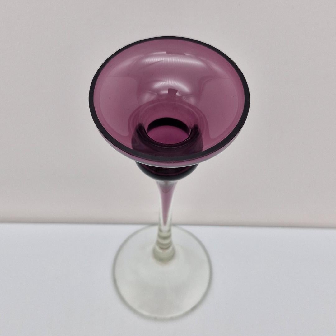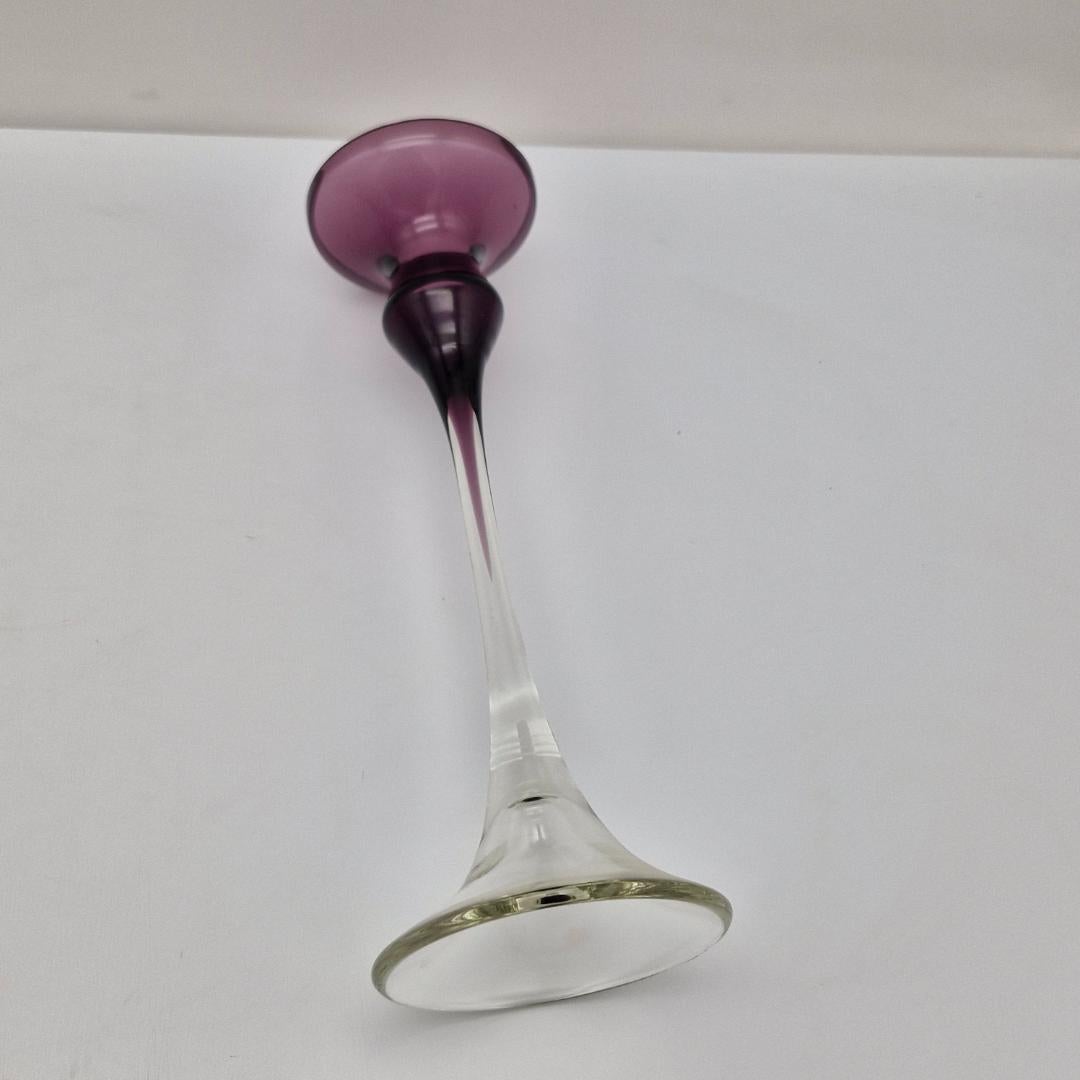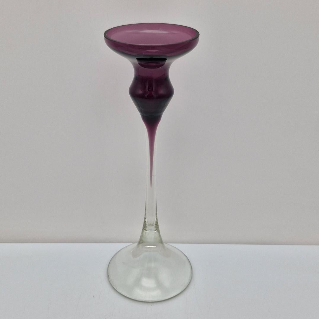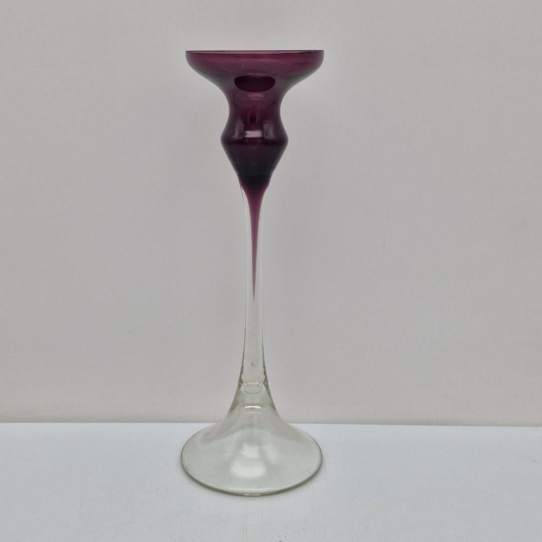 Kynttilänjalka lila, Marjut Kumela. Marjut Kumelan suunnittelema näyttävä kynttilänjalka lilan väristä ja kirkasta lasia, korkeus n. 23 cm. Valmistettu vuosina 1964-1976, malli 354..