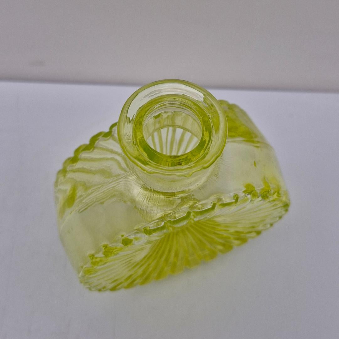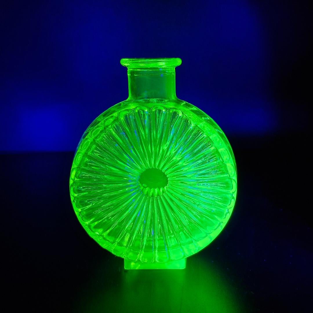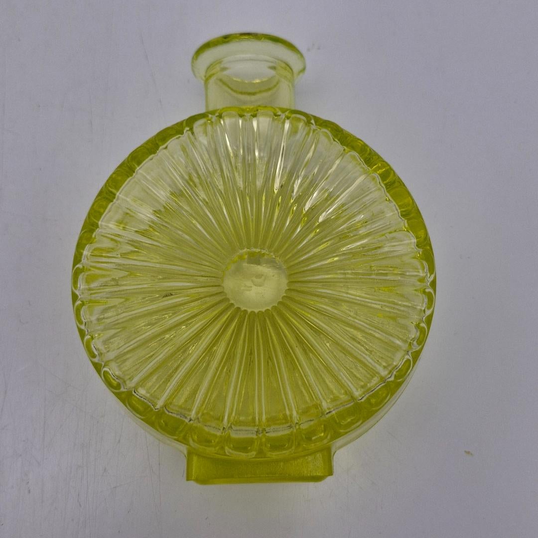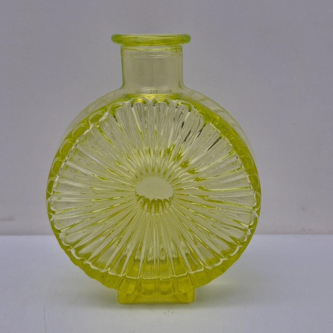 Riihimäen Lasi, Aurinkopullo, keltainen 1/4, Helena Tynell. Helena Tynellin Riihimäen lasille suunnittelema keltainen Aurinkopullo, koko 1/4. UV-valossa hohtavaa uraanilasia.