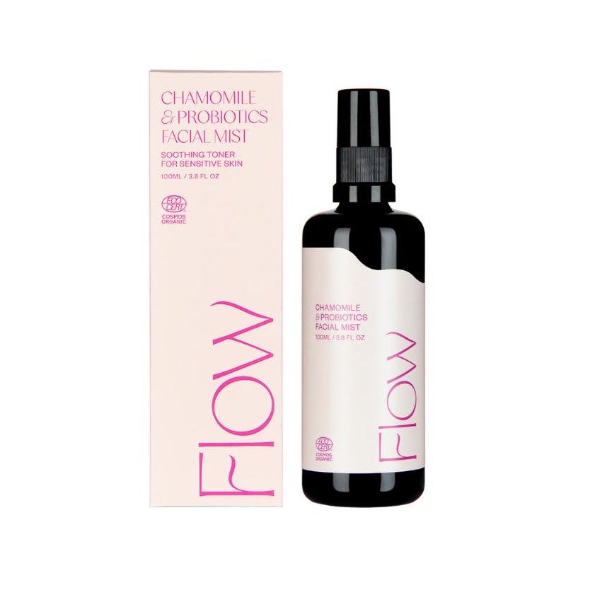 FLOW Cosmetics Probioottinen Luomu Kamomillavesi - Chamomile & Probiotics Facial Mist 100ml on kosteuttava ja hoitava suihkutettava kasvovesi, joka sopii erityisesti ärtyneelle, punoittavalle ja kuivalle iholle. Probiootteja sisältävä kasvovesi auttaa myös ennaltaehkäisemään iho-ongelmia tukemalla ihon hyvänlaatuista mikrobikantaa.