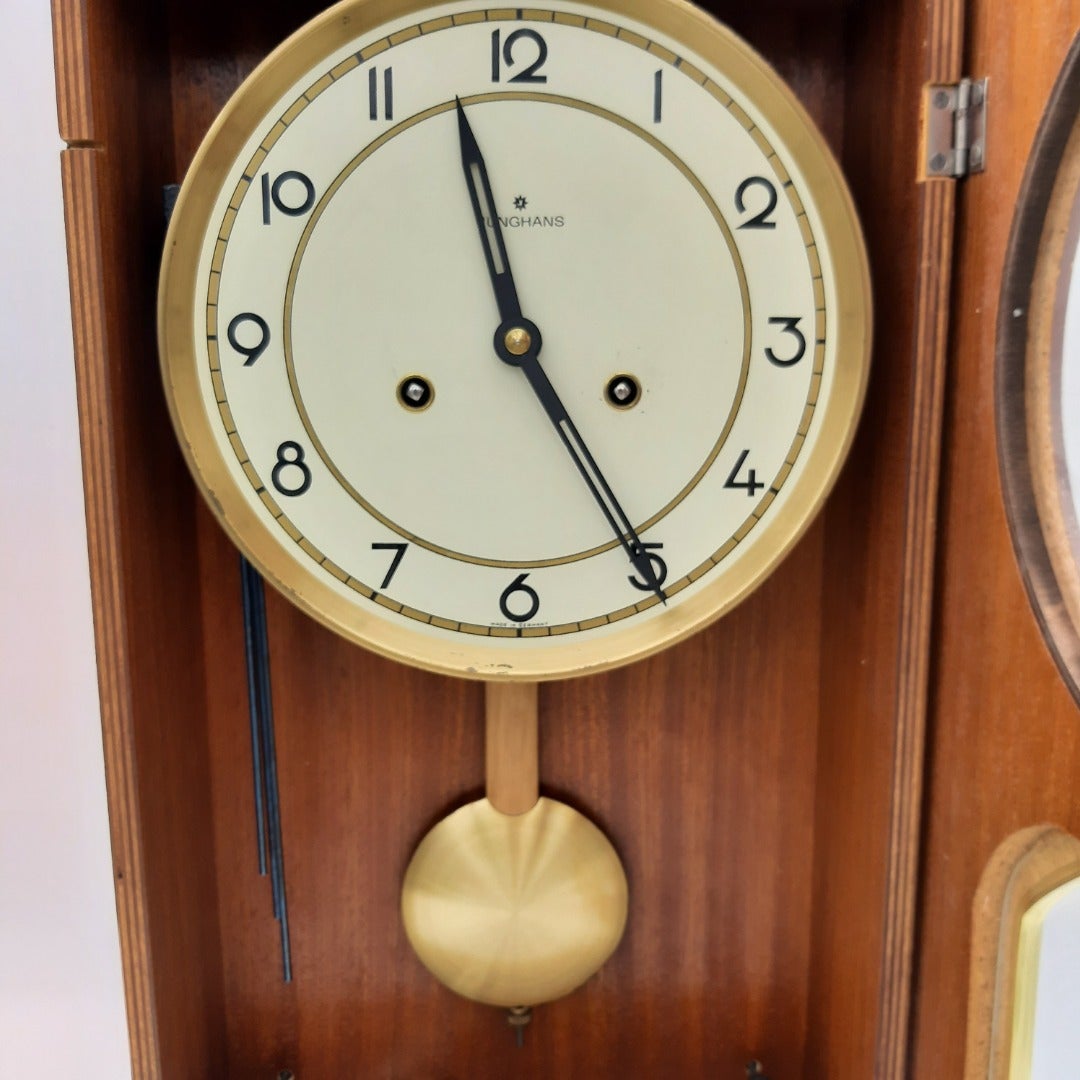 Komia Junghanssin valmistama seinäkello heilurilla. Kello käy ja lyö hienosti, myös kuoret todella siistit. Kellon etureunassa messinkilaatta jossa teksti Palorantalaiset 30.5.70, laatta on kuitenkin irrotettavissa mikäli kovastikin häiritsee. Huom. Muistathan asentaa seinäkellon myös syvyyssuunnassa suoraan toiminnan varmistamiseksi!