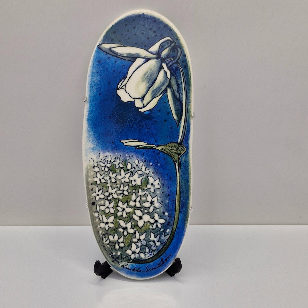 Arabia Seinälaatta Aikaan Valkovuokkojen, Heljä Liukko-Sundström. Heljä Liukko-Sundströmin suunnittelema kaunis keväinen seinälaatta nimeltään Aikaan Valkovuokkojen, 1990-luku. Korkeutta koristelaatalla on 32 cm, leveys 13 cm.