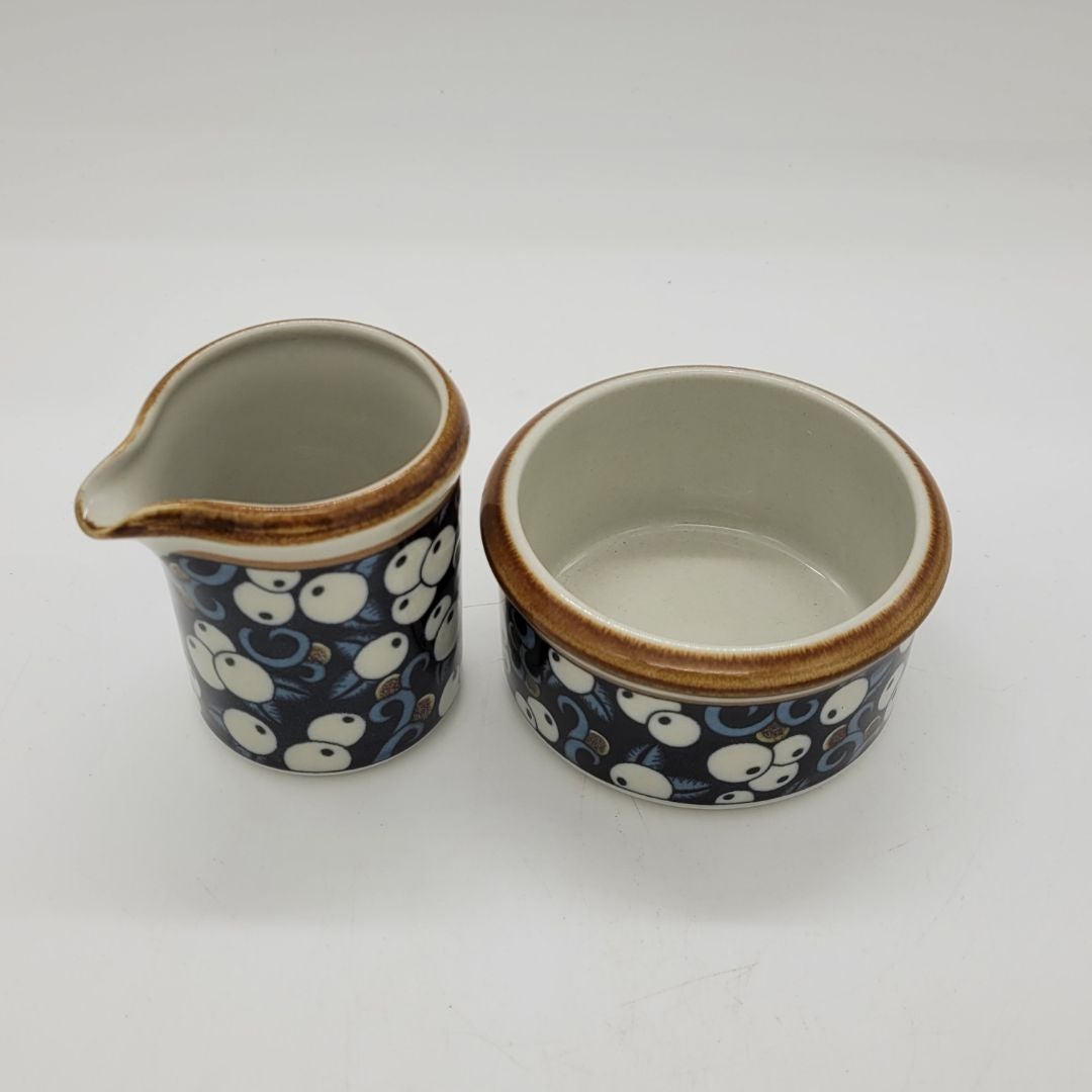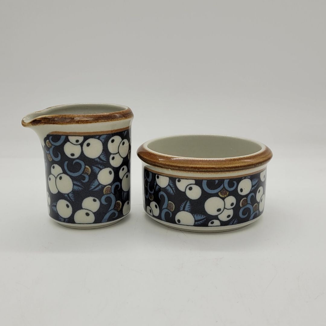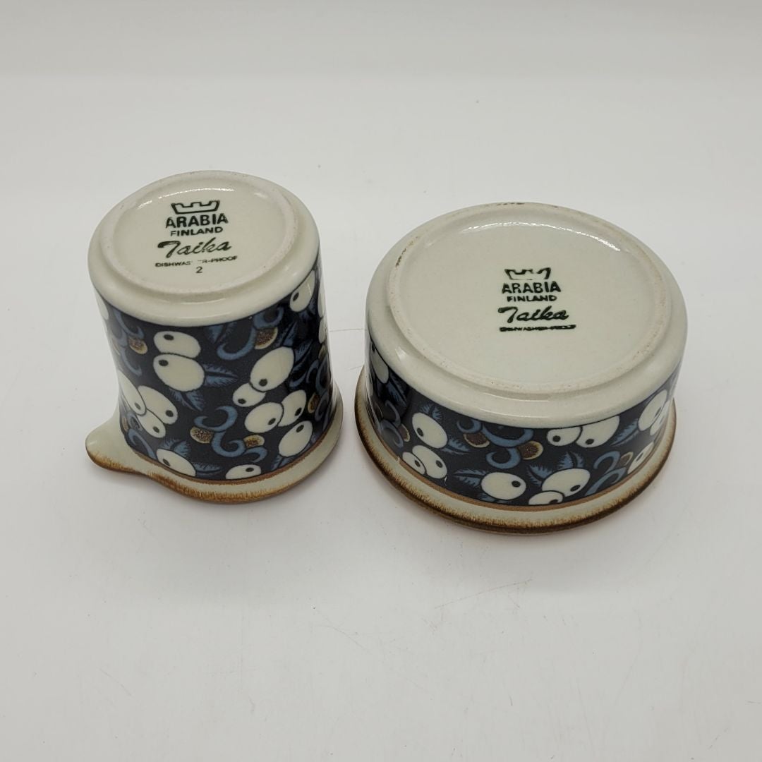 Arabia Taika Mustikka Kermakko ja Sokerikko. Kaunis Mustikka-aiheinen Taika-serikuvakoriste on Inkeri Seppälän (Leivo) suunnittelema ja sitä on käytetty vuosina 1976-1979 Anja Jaatinen-Winquistin suunnittelemassa M-astiastossa, joka on kivitavaraa.