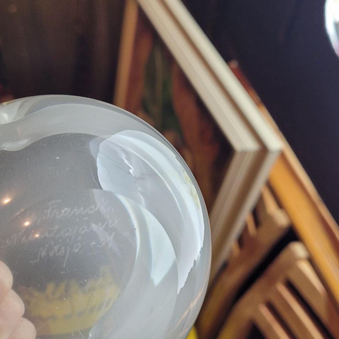 Kaj Franck Tuhka-astia KF 107, signeerattu. Kaj Franckin suunnittelema kaunis pieni esine kirkasta lasia, signeerattu Kaj Franck Nuutajärvi Notsjö -54. Korkeus 5,5 cm ja leveys 9 cm x 10,5 cm. Harvoin myynnissä.