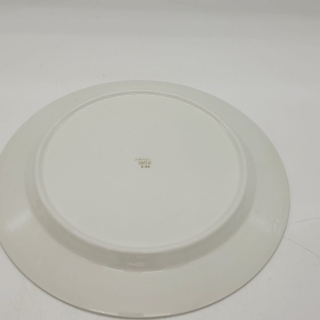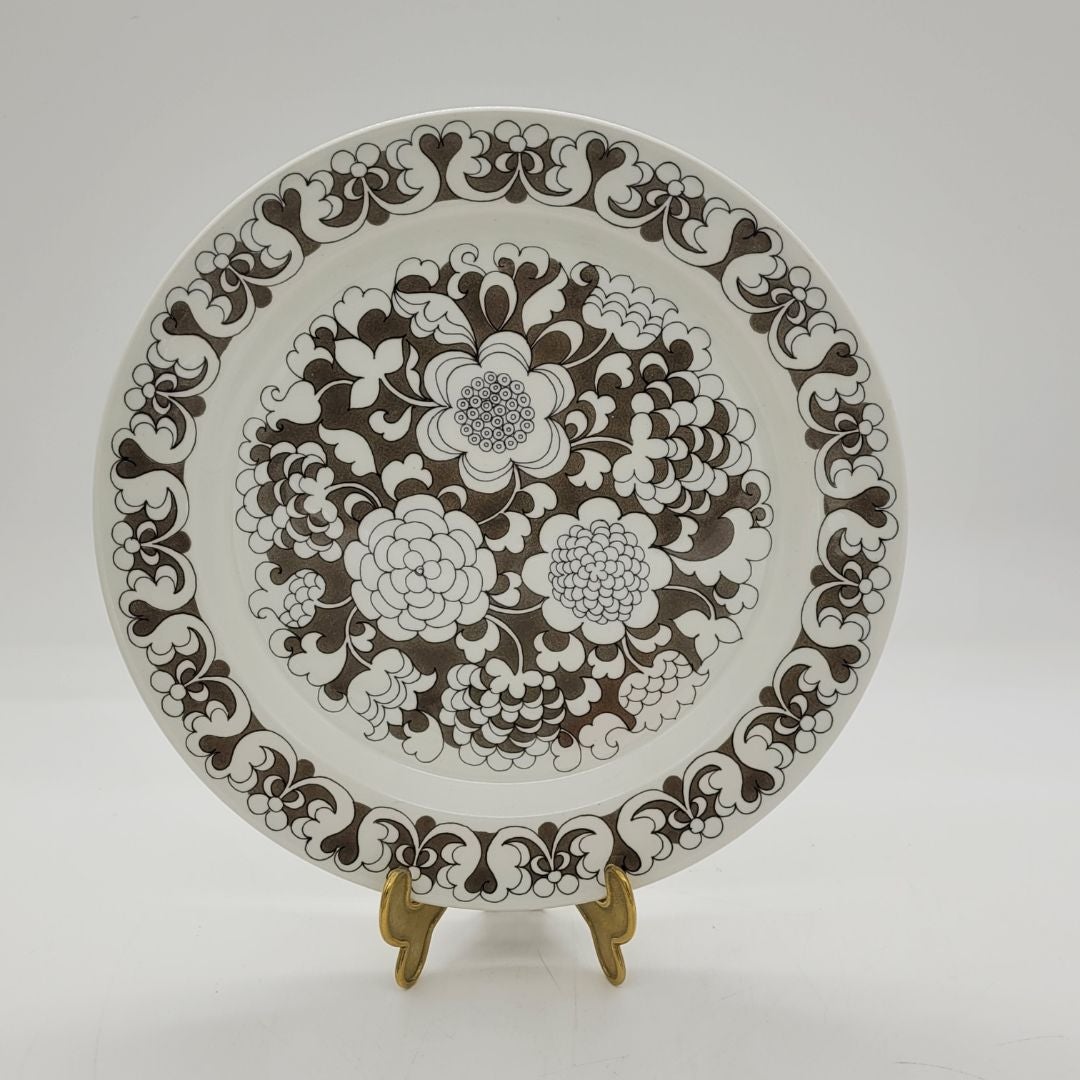 Arabia Gardenia Matala Lautanen 26 cm, ruskea-valkoinen. Matala ruokalautanen tai tarjoilulautanen, pikkukruunuleima, v. 1969. Kaunis Gardenia-koriste on Esteri Tomulan suunnittelema. Lautasen halkaisija n. 26 cm.