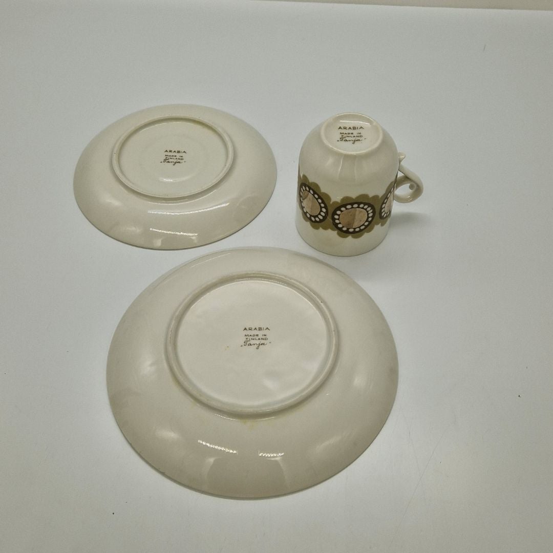 Arabia Tanja Kahvikuppi ja Lautaset (2), Esteri Tomula. Esteri Tomulan suunnittelema kahvikuppi, asetti ja pullalautanen, valmistettu vuosina 1971-1972. Koristeen nimi Tanja.