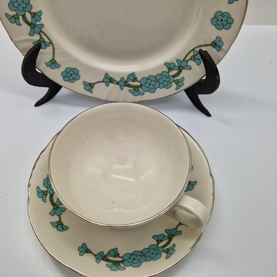Arabia Morsian Kahvikuppi ja Lautaset, turkoosi. Settiin kuuluu kahvikuppi, asetti ja pullalautanen.