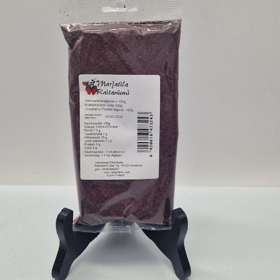 Marjatila Raitaniemi, Variksenmarjajauhe 100 g. Kotimaista 100% variksenmarjajauhetta pussitettuna, ilman lisättyä sokeria, säilöntä- tai lisäaineita.