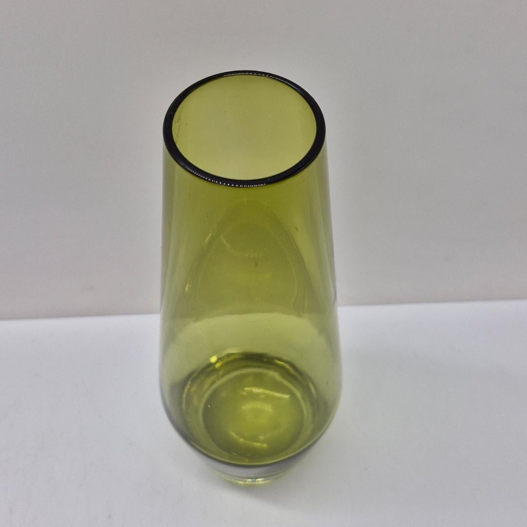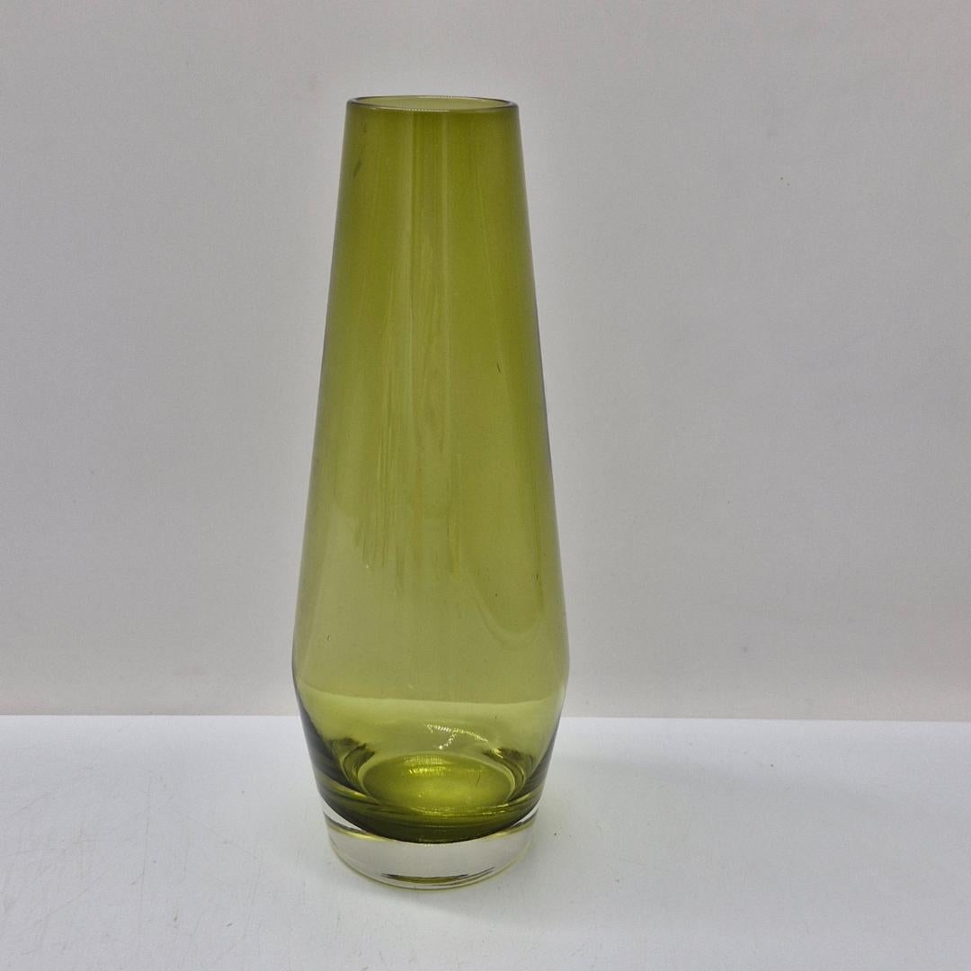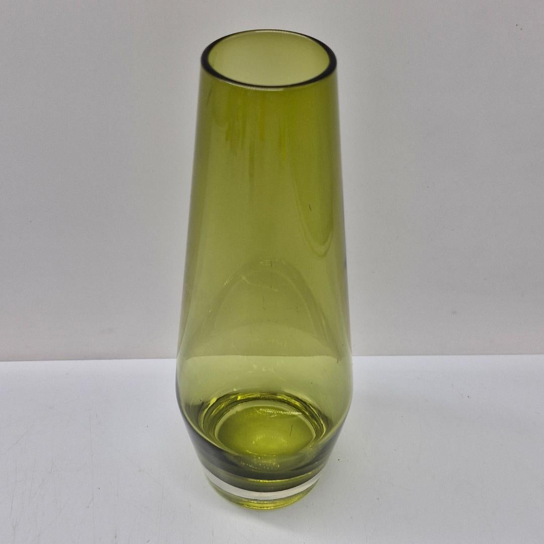 Riihimäen Lasi Maljakko 21 cm, vihreä. Riihimäen Lasin vihreä maljakko, alaosa kirkasta lasia. Maljakon korkeus n. 21 cm.