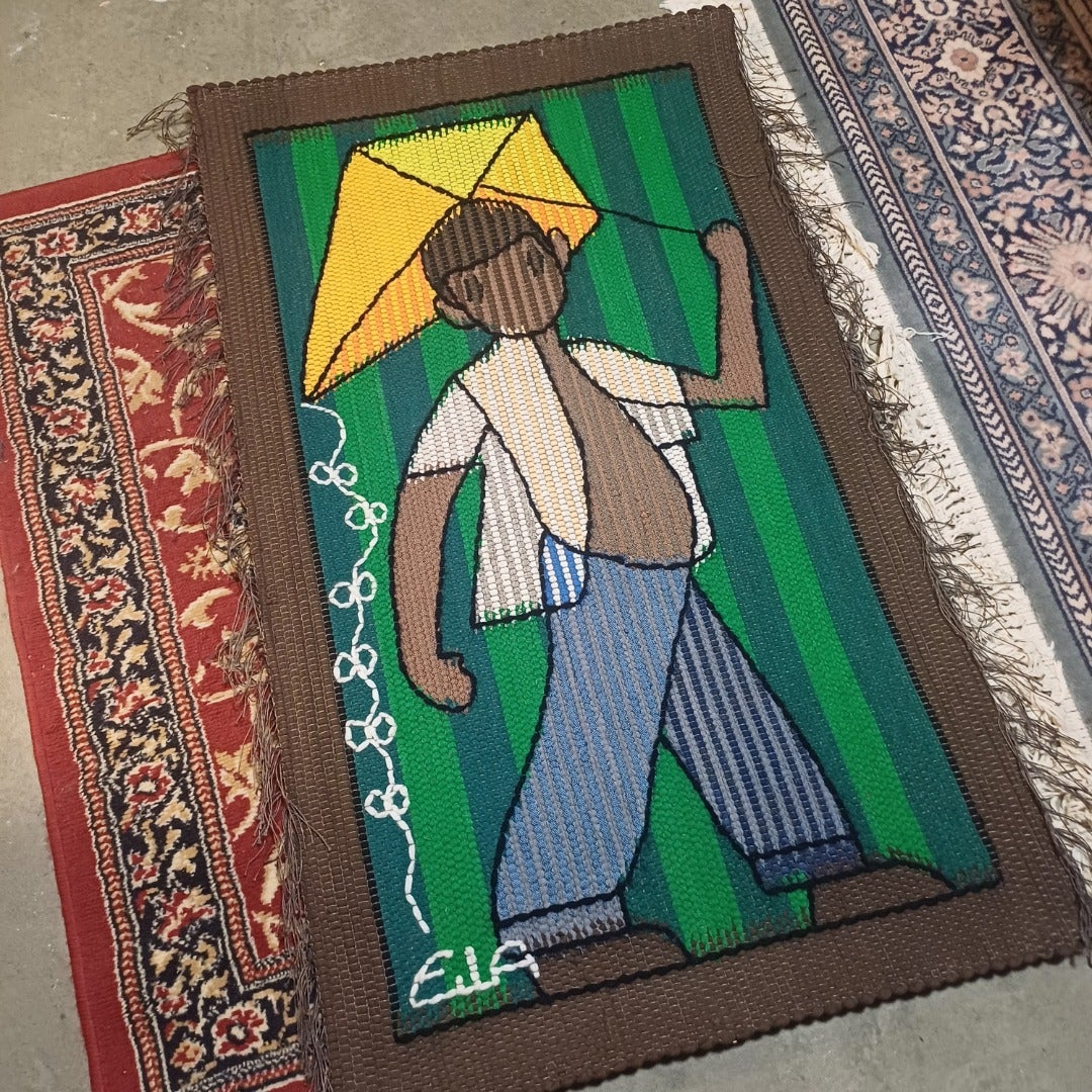 Eila Ampulan ( 1916-2008 ) suunnittelema kuvakudos, Brasilialainen Poika. Kudoksessa selkeät ja kirkkaat värit, kudos on muutenkin puhdas ja siisti. Työ on signeerattu, kiinnitys seinään metallilenkillä.