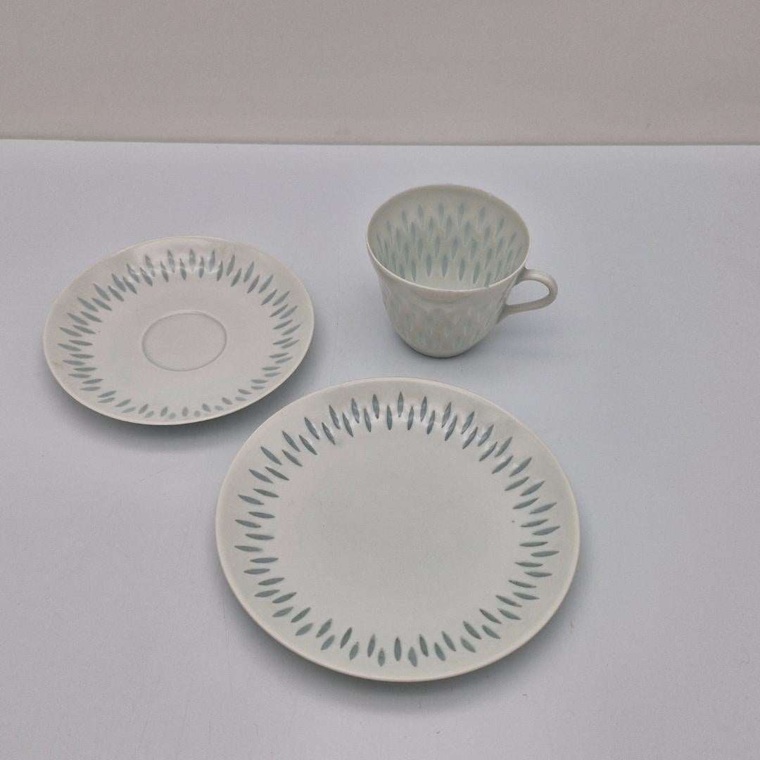 Arabia Riisiposliini Kahvikuppi, Asetti ja Pullalautanen. Arabian valmistama kaunis Riisiposliini kahvikuppisetti, design Friedl Holzer-Kjellberg. Settiin kuuluu kahvikuppi, asetti, sekä pullalautanen.