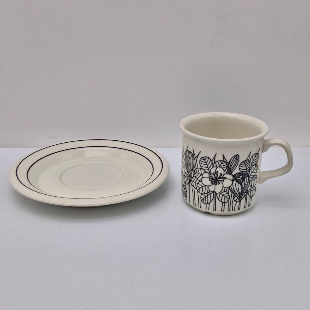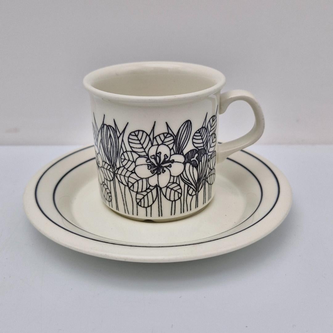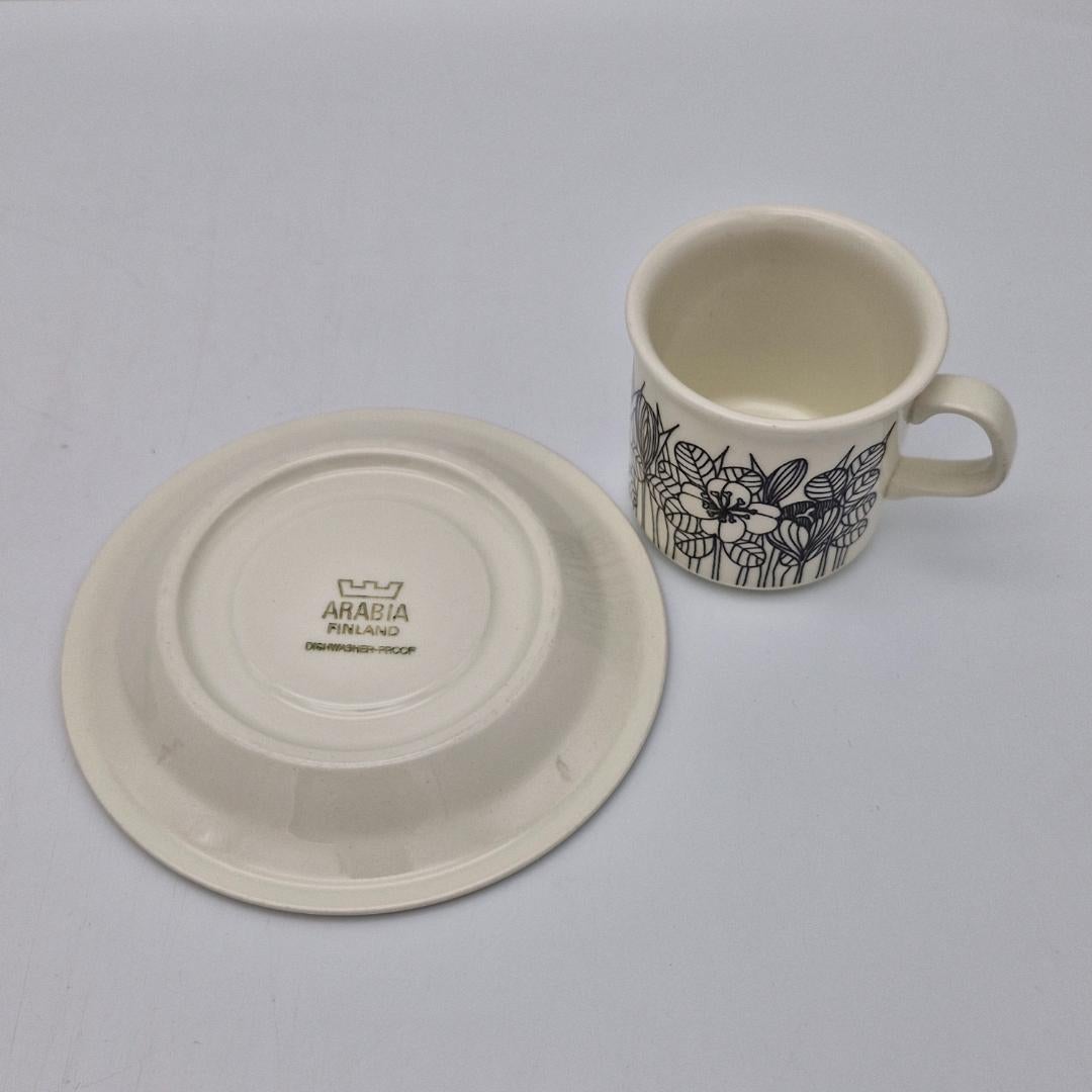 Arabia, Krokus Mokkakuppi ja Asetti, mustavalkoinen. Esteri Tomulan suunniteleman Krokus-sarjan mokkakuppi tasseineen mustavalkoisella koristeella, tuotannossa v. 1978-1979.