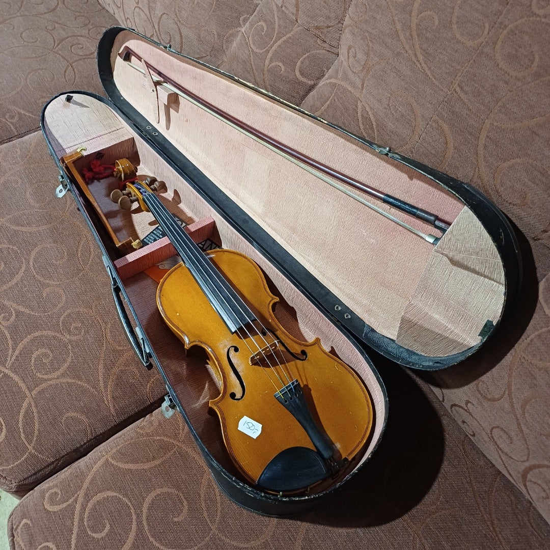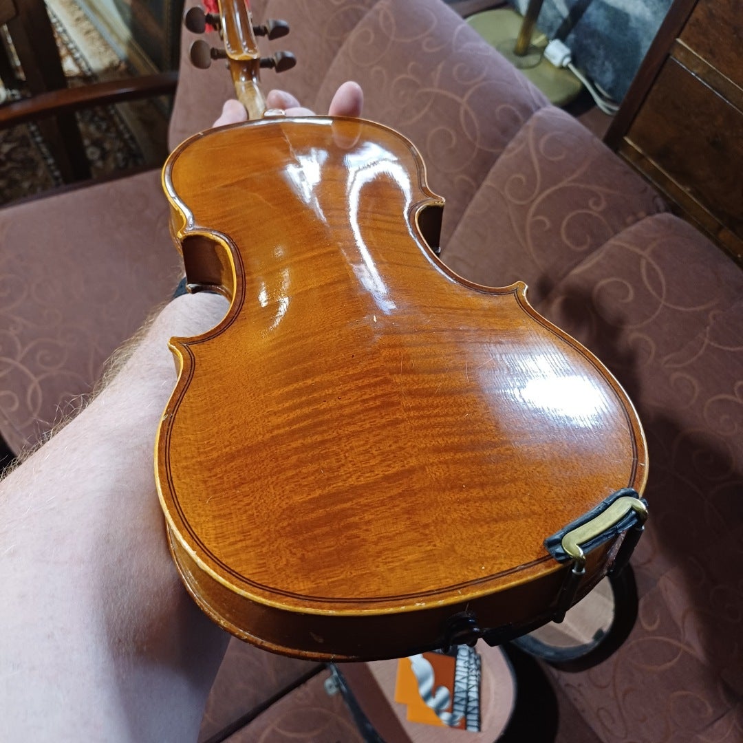 Kuoret kuitenkin kohtuullisen siistissä kunnossa ikäisekseen, kielet ovat soittokunnossa. Mukana myös kuljetuskotelo. Kaikupohja viulussa 310mm pitkä, joten on siis 3/4 kokoinen yksilö. Sisällä valmistajan leima, valmistettu arvioidusti 1900-luvun alkupuolella.