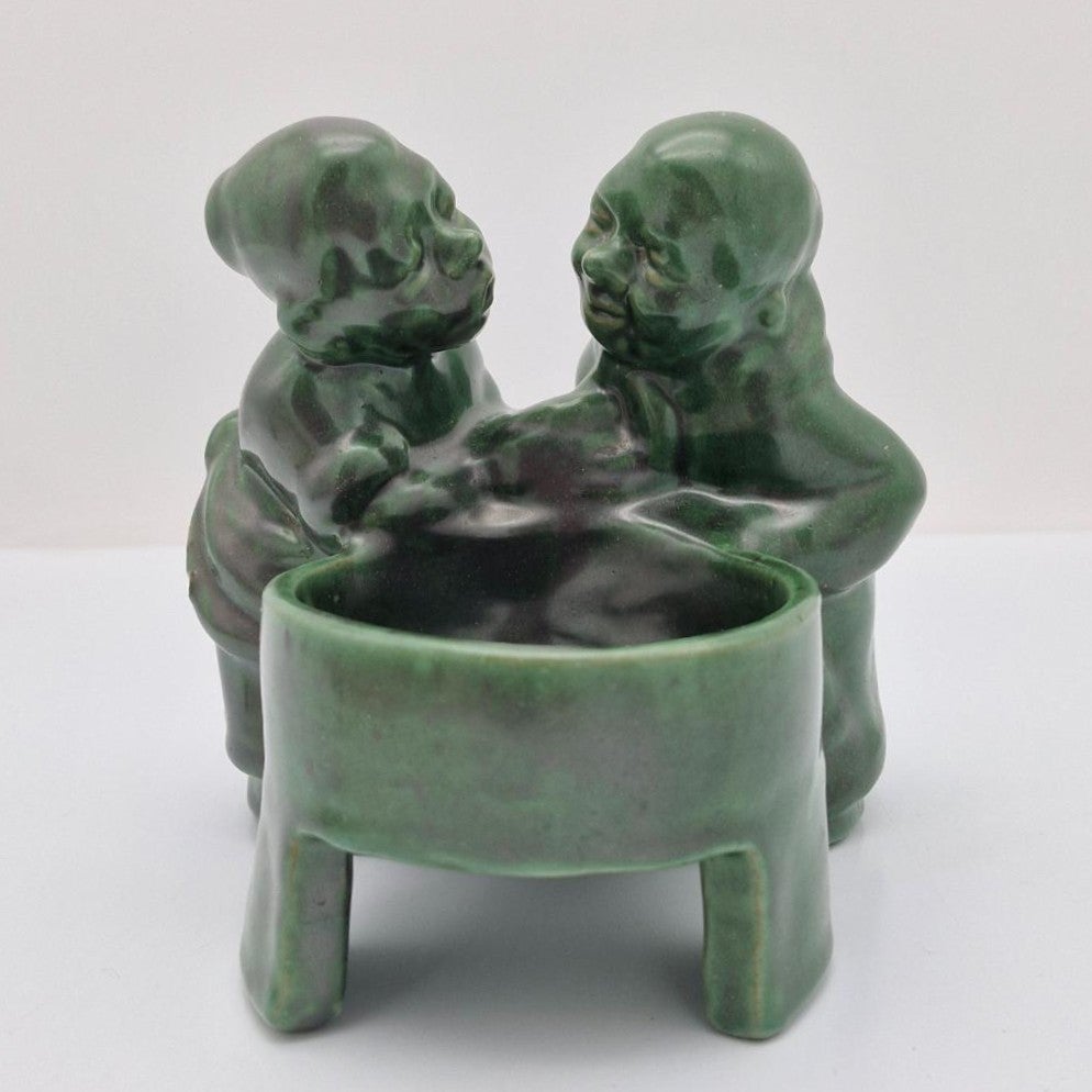 Kupittaan Savi, Pyykkärit Figuuri, vihreä. Kupittaan Saven hieno vanha Pyykkärit figuuri. Pyykkärit lienee tunnetuimpia Kupittaan Saven valmistamia hahmoja Matin ja Maijan ohella. Figuurin korkeus n. 14,5 cm ja leveys 15 cm.