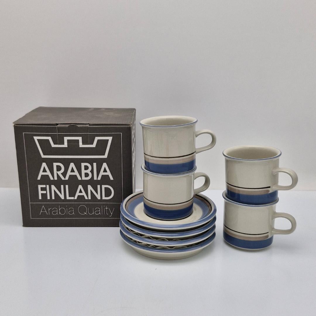 Arabia Uhtua Kahvikuppi & Asetti, 4 kpl pakkaus. Tarjolla 4 kupin ja asetin Uhtua-kahvikuppisarja alkuperäispakkauksessaan. Uhtua on Inkeri Leivon suunnittelema raitakoriste, joka on ollut tuotannossa vuosina 1982-1999, malli S, Ulla Procope.