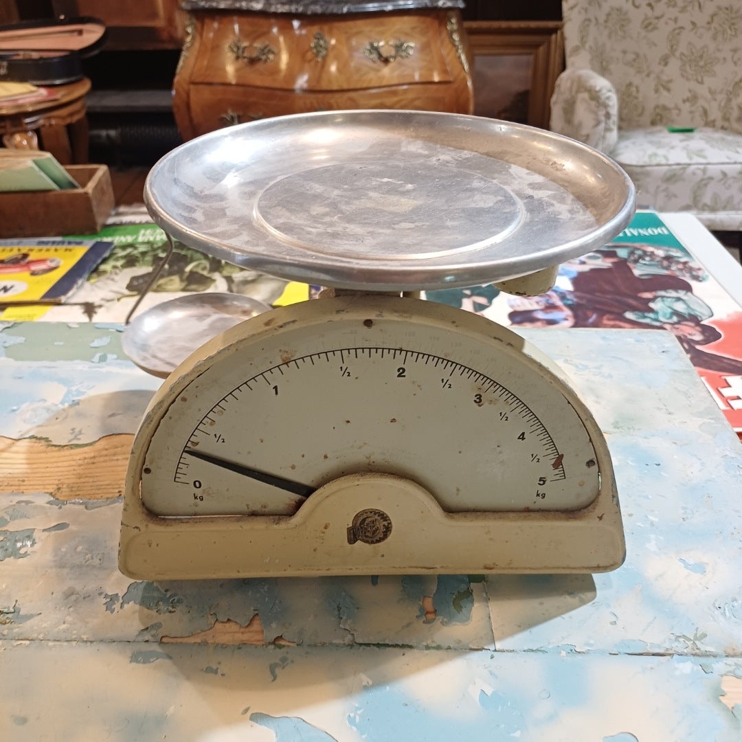 Hieno vanha vaaka vintage-sisustajalle tai käyttöön, punnituskykyä 5 kg saakka. Tyylikkäästi patinoitunut vanha vaaka, kuitenkin täysin toimiva ja ehjä osiltaan.