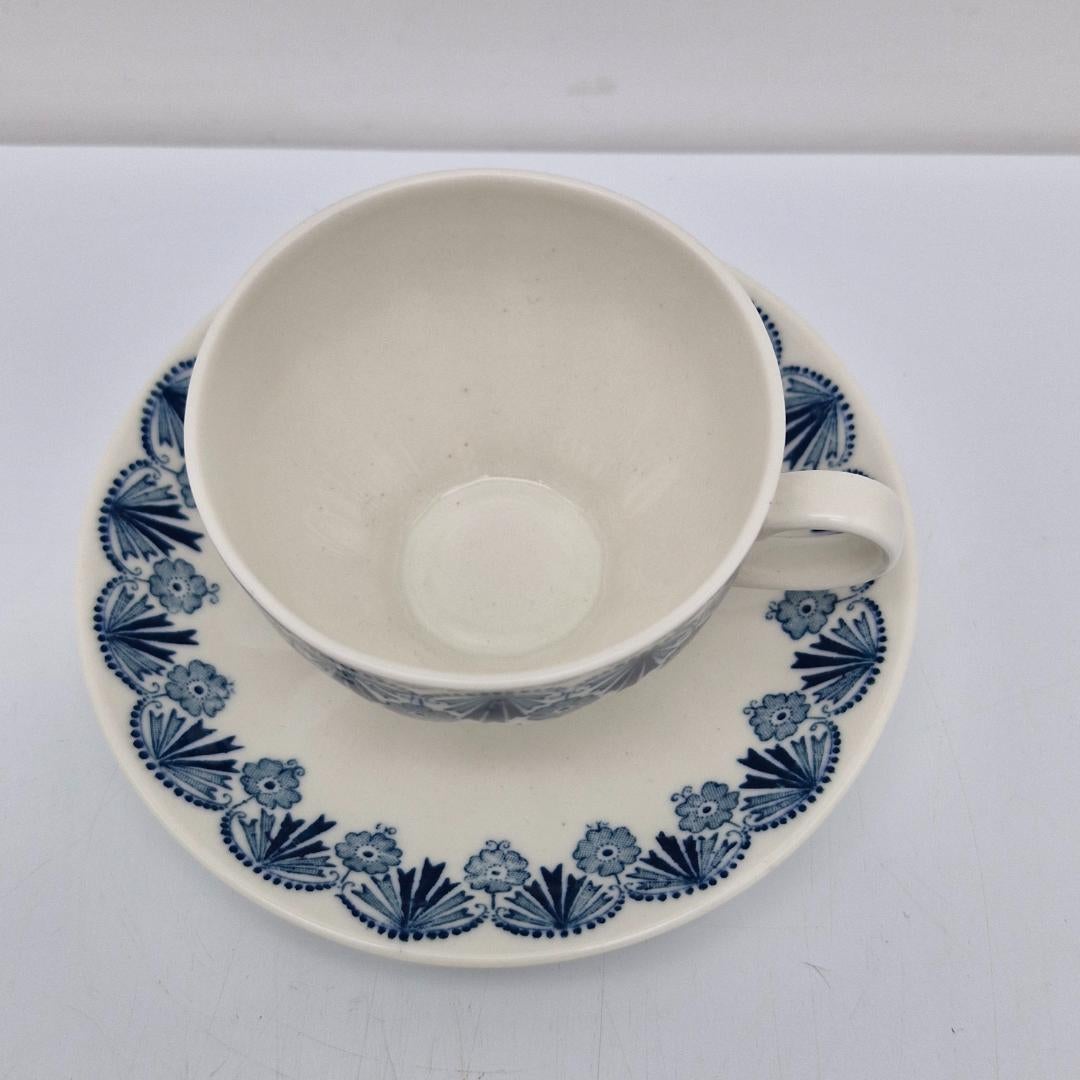 Arabia Sohvi Kahvikuppi ja Asetti, siniharmaa koriste. Kahvikuppi on Kaj Franckin v. 1949 suunnittelema OZ-malli, jossa Raija Uosikkisen suunnittelema serikuvakoriste Sohvi. Sohvi on ollut tuotannossa vuosina 1961-1979.