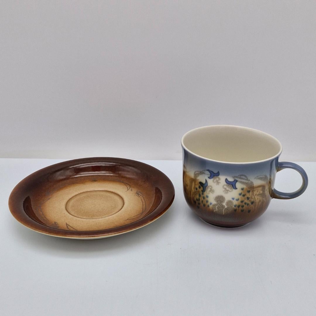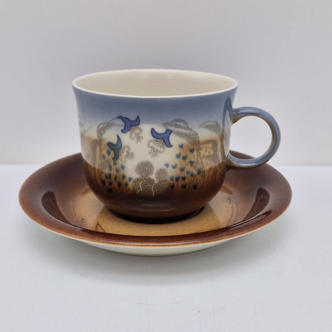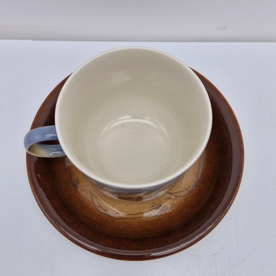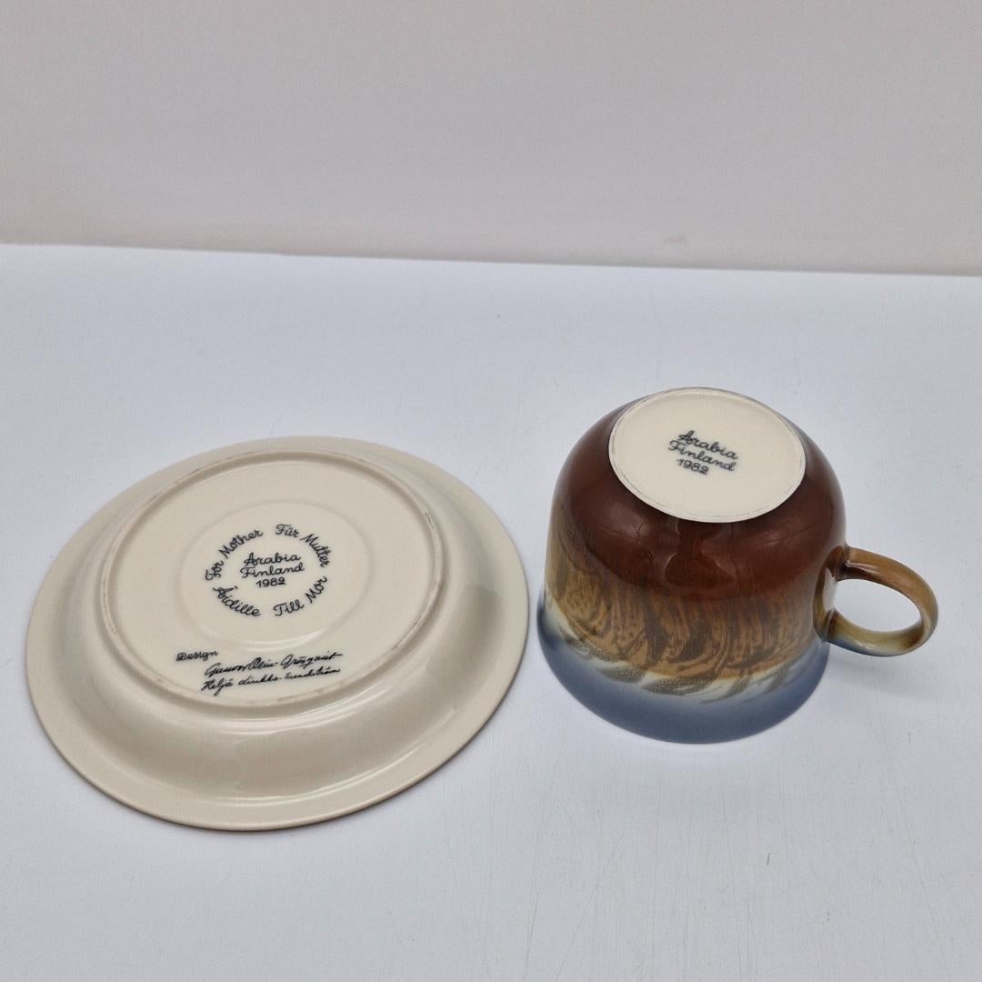Arabia, Äidille Vuosikuppi 1982. Koristeen on suunnitellut Heljä Liukko-Sundström, kupin malli Gunvor Olin-Grönqvist. Kupin korkeus n. 7,5 cm ja halkaisija n. 9 cm, lautasen halkaisija 16 cm.