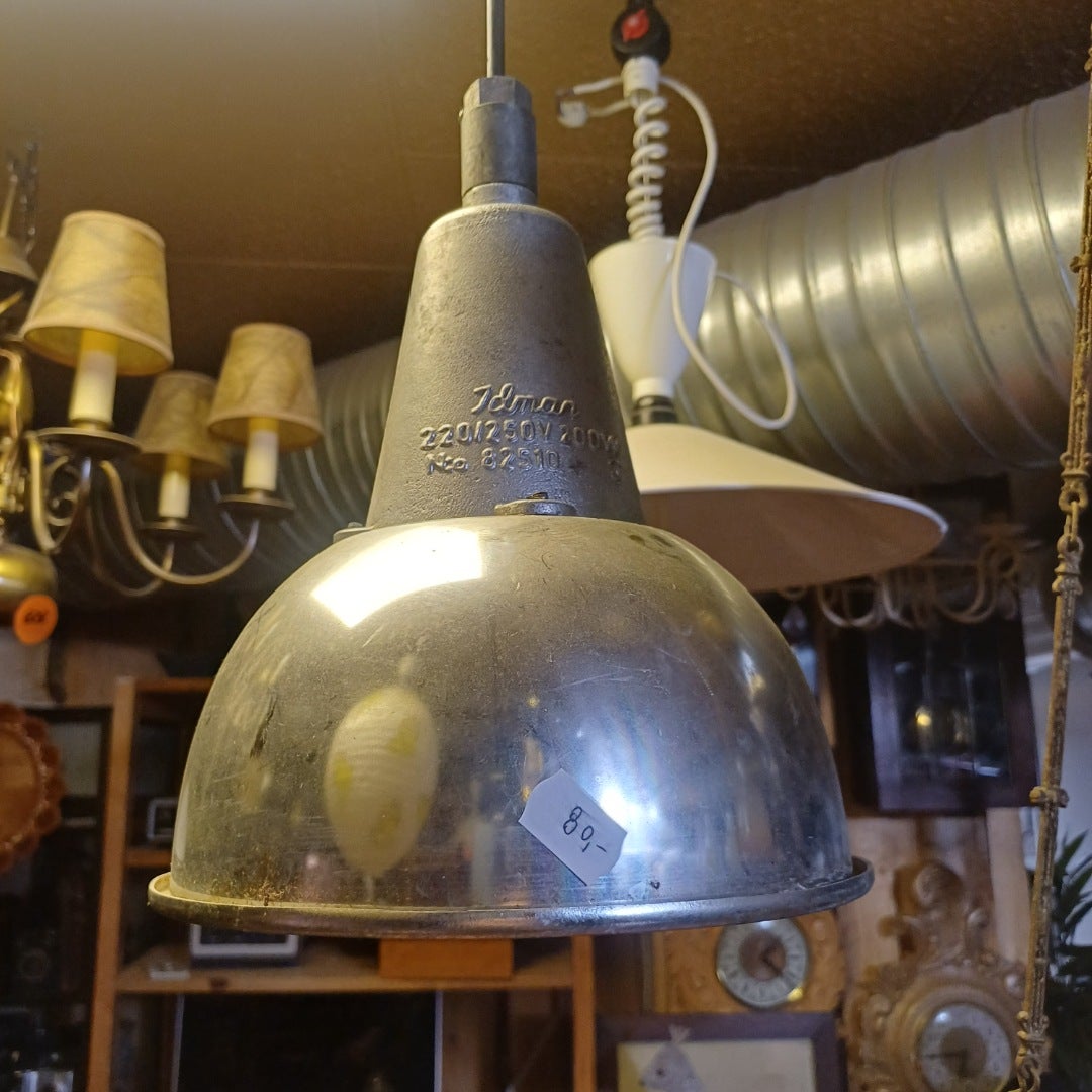 Idmanin valmistama teollisuusvalaisin, tuotenumero 82510. Valaisin on metalliosiltaan reilusti patinoitunut, varustettu kuitenkin uusituilla sähköillä. Polttimo E27, kytkentä sokeripalalla.