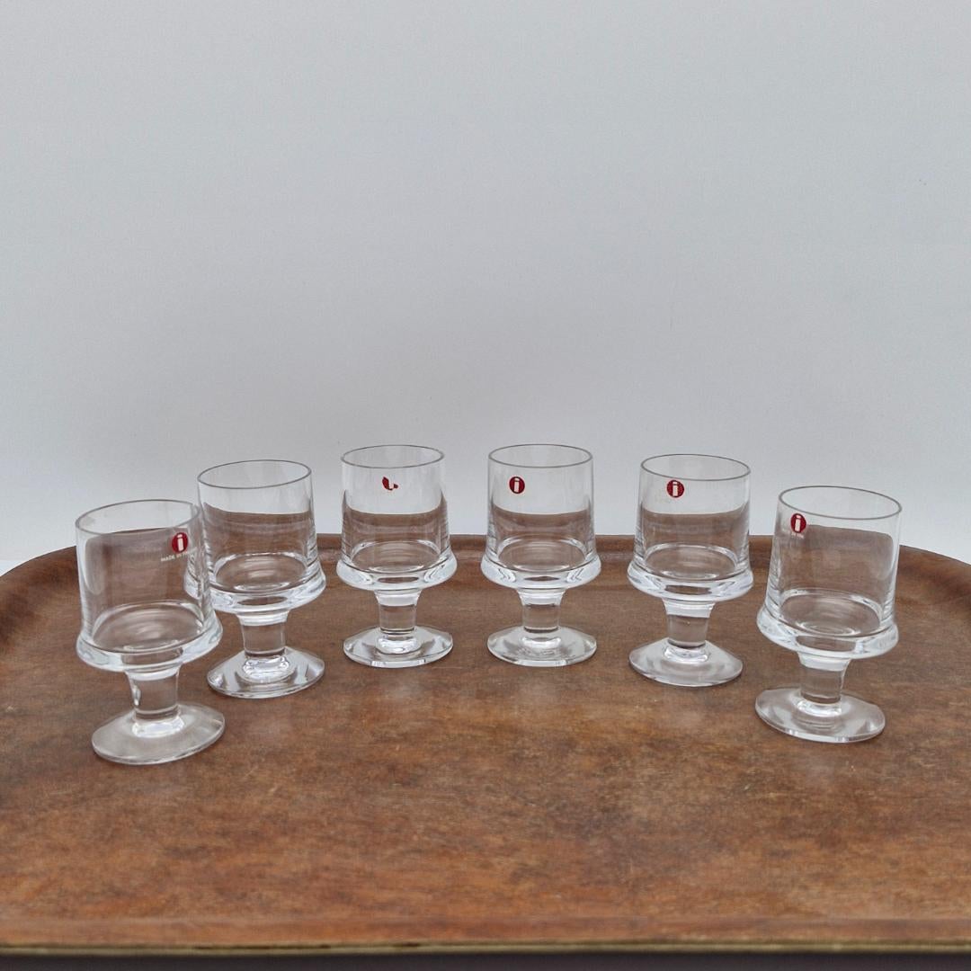 Iittala, Marski Snapsilasit 6 kpl. Tapio Wirkkalan suunnitteleman Marski-sarjan jalalliset kirkkaat snapsilasit 6 kpl settinä. Korkeus 7,5 cm, halkaisija 3,5 cm.